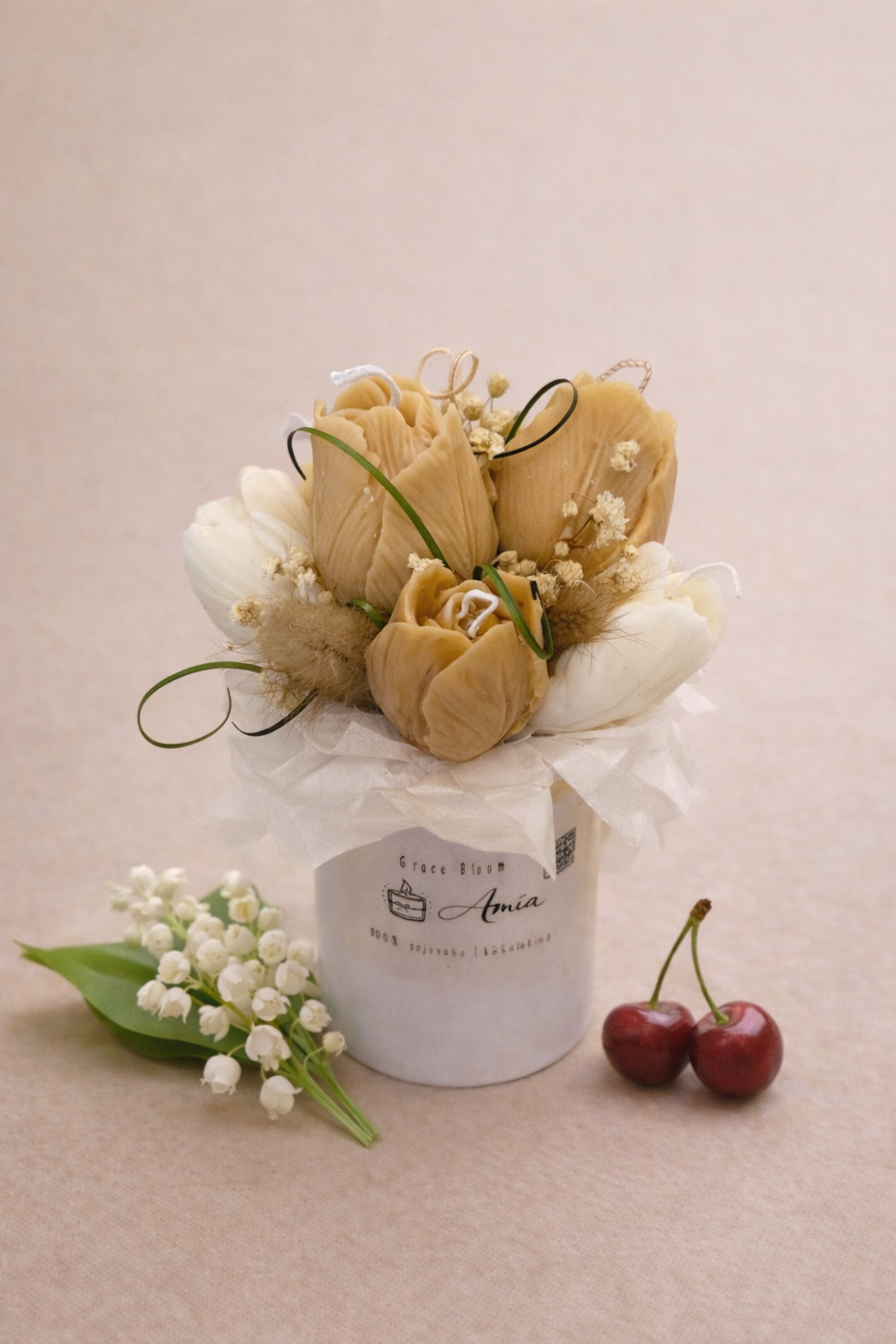 Grace Bloom on graatsiline ja ajatu küünlakimp, kus käsitsi valmistatud õieküünlad loovad rahuliku ja elegantse meeleolu. Helged õrnad toonid ning hoolikalt läbimõeldud detailid annavad kimbule puhta ja väärika ilme.