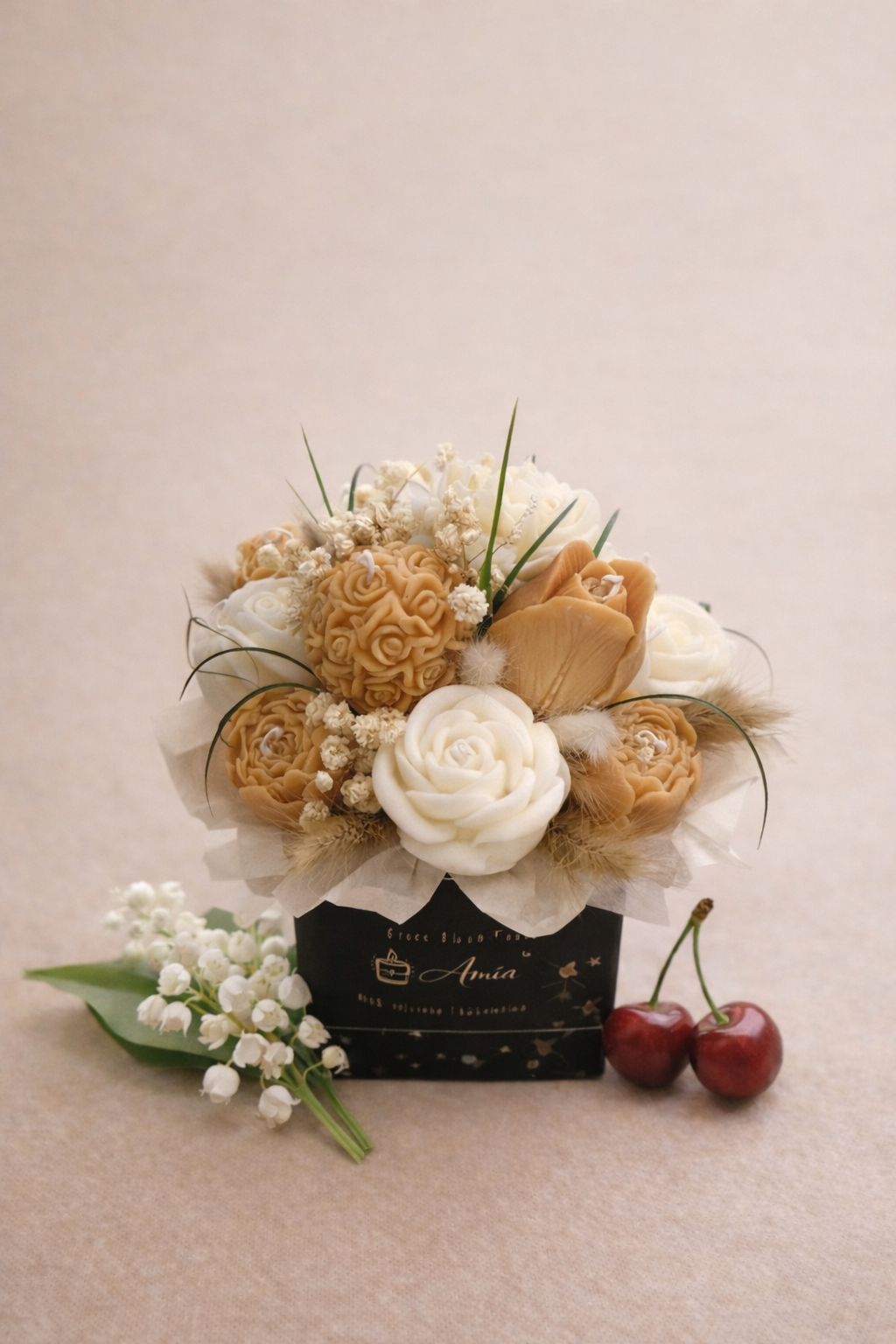 Grace Bloom on graatsiline ja ajatu küünlakimp, kus käsitsi valmistatud õieküünlad loovad rahuliku ja elegantse meeleolu. Helged õrnad toonid ning hoolikalt läbimõeldud detailid annavad kimbule puhta ja väärika ilme.