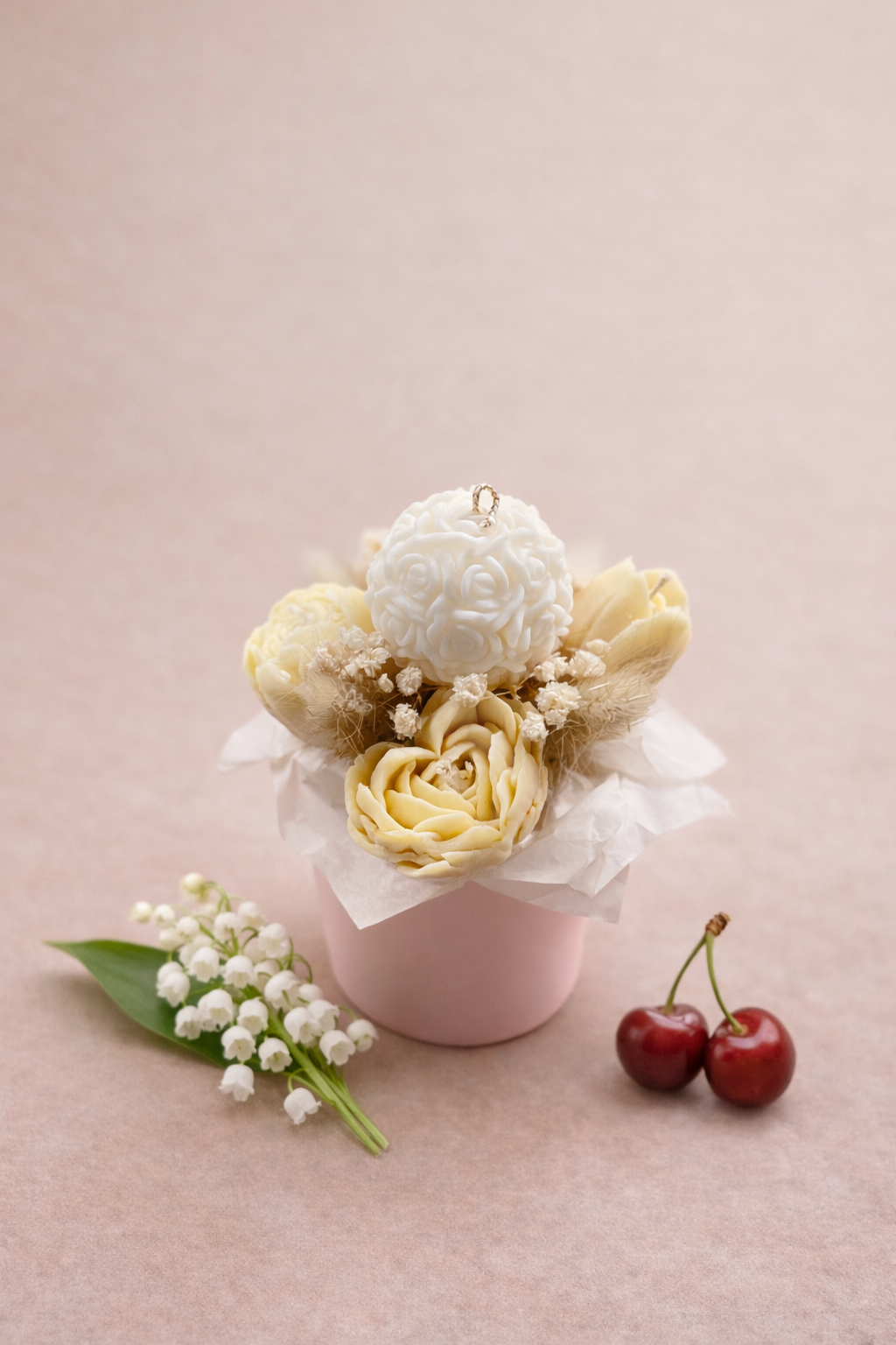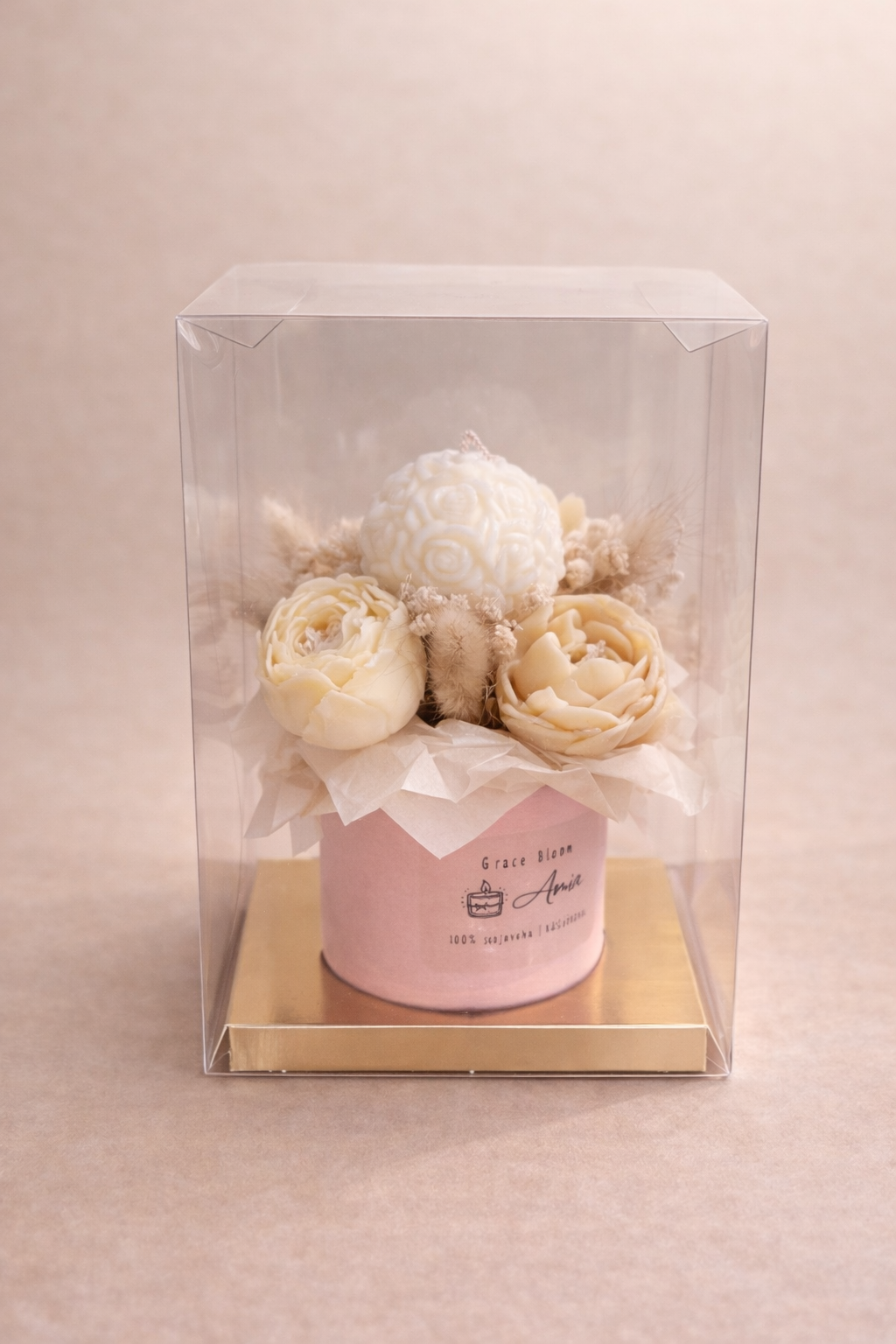 Grace Bloom on graatsiline ja ajatu küünlakimp, kus käsitsi valmistatud õieküünlad loovad rahuliku ja elegantse meeleolu. Helged õrnad toonid ning hoolikalt läbimõeldud detailid annavad kimbule puhta ja väärika ilme.